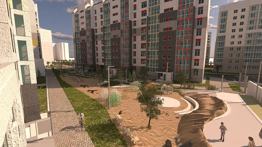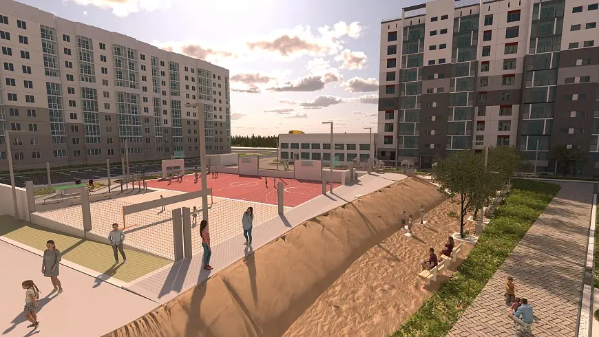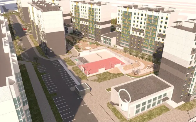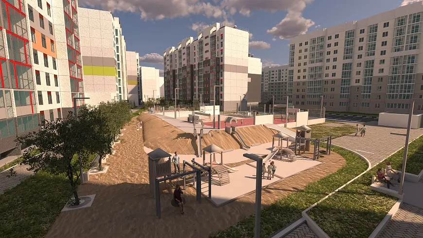 Мы создаем “живую” площадку, которая не надоест детям всех возрастов. Внутренняя территория разделена на зоны для подвижных игр в волейбол, баскетбол, зону с тренажерами и снарядами для воркаута и фитнеса, детские площадки, места для отдыха и прогулок.